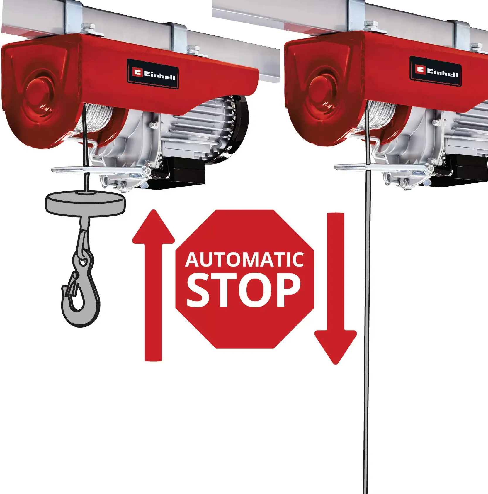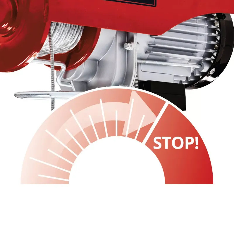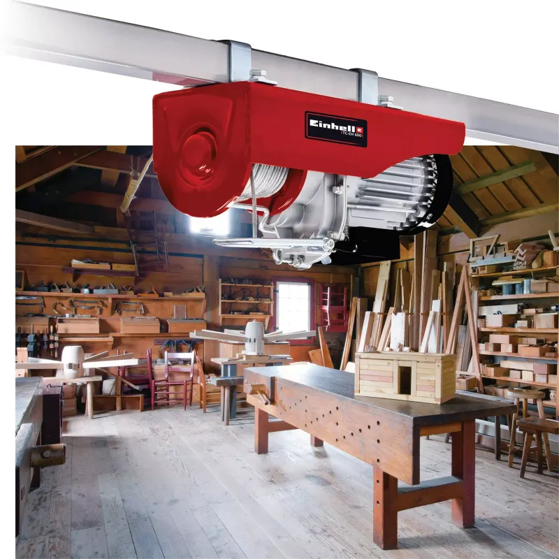 DIZALICA ELEKTRIČNA TC-EH 600 EINHELL moćan je pomoćnik kada je potrebno podići i transportirati teške terete u hobi radionici, garaži ili na kućnom gradilištu. Einhell je veliku vrijednost stavio na funkcionalnost: dizalica je opremljena žičanim sajlom bez uvijanja koja je duga preko 18 metara (promjer 4,5 milimetara) umjesto samo 12 metara, tako da je visina dizanja bez koloture do 18 metara a mogu se prevoziti tereti od 300 kilograma – brzinom od osam metara u minuti. Uz pomoć koloture, težina dizanja može se povećati na 600 kilograma, visina dizanja je devet metara, a brzina dizanja četiri metra u minuti.