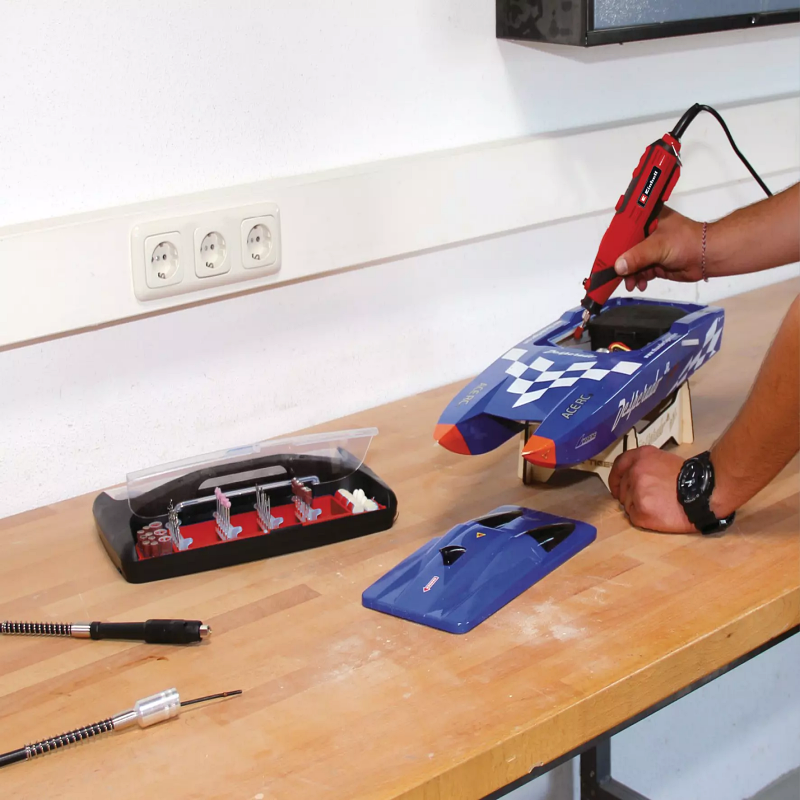 VIŠENAMJENSKA BRUSILICA TC-MG 135 E EINHELL sa raznolikim priborom za brušenje, bušenje, glodanje, poliranje i četkanje sa prihvatom koji omogućuje upotrebu različitih nastavaka. Uz ovaj uređaj je moguće koristiti produžni nastavak kako bi lakše pristupili nedostupnim mjestima. Tijekom rada s produžnim nastavkom bušilicu je moguće odložiti na teleskopski stalak. Dodatnih 189 nastavaka koji se isporučuju s ovim alatom jamče obavljanje raznih zahtjeva korisnika. Sve navedeno se isporučuje u praktičnom koferu.