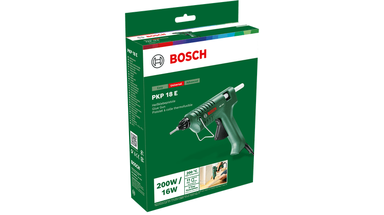Električni pištolj za vruće lijepljenje PKP 18 E jamči neprekidan dovod ljepila i stabilnu snagu lijepljenja za izvrsne rezultate. Njegov grijaći element s elektroničkim upravljanjem jamči konstantnu radnu temperaturu i brzo pokretanje. Zahvaljujući sustavu mehaničkog napajanja jamči preciznu kontrolu nanosa ljepila za brzu i ciljanu primjenu. Savršen je za svakodnevne zadatke lijepljenja, primjerice ukrašavanje ili popravak na materijalima kao što su drvo, karton, kamen i još puno toga. Kompatibilan je sa štapićima ljepila od 11 mm i isporučuje se s iznimno dugačkom sapnicom za doseg uskih i zavučenih područja.
