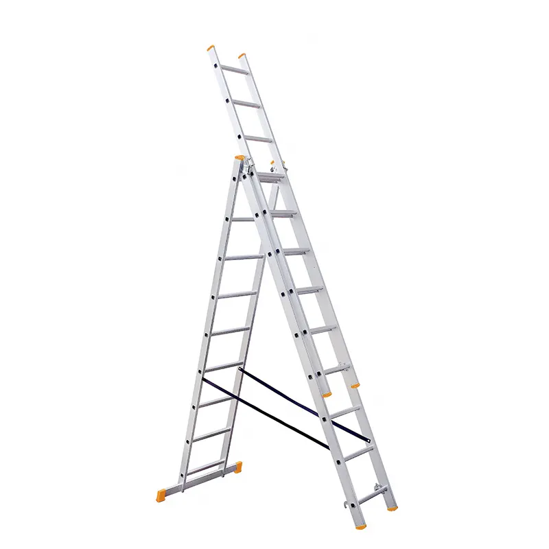 Trodijelne aluminijumske kombinovane merdevine 3×9 gazišta. Sa protivkliznim kapama maksimalne visine 5,36m. (radna visina 9,93 m)