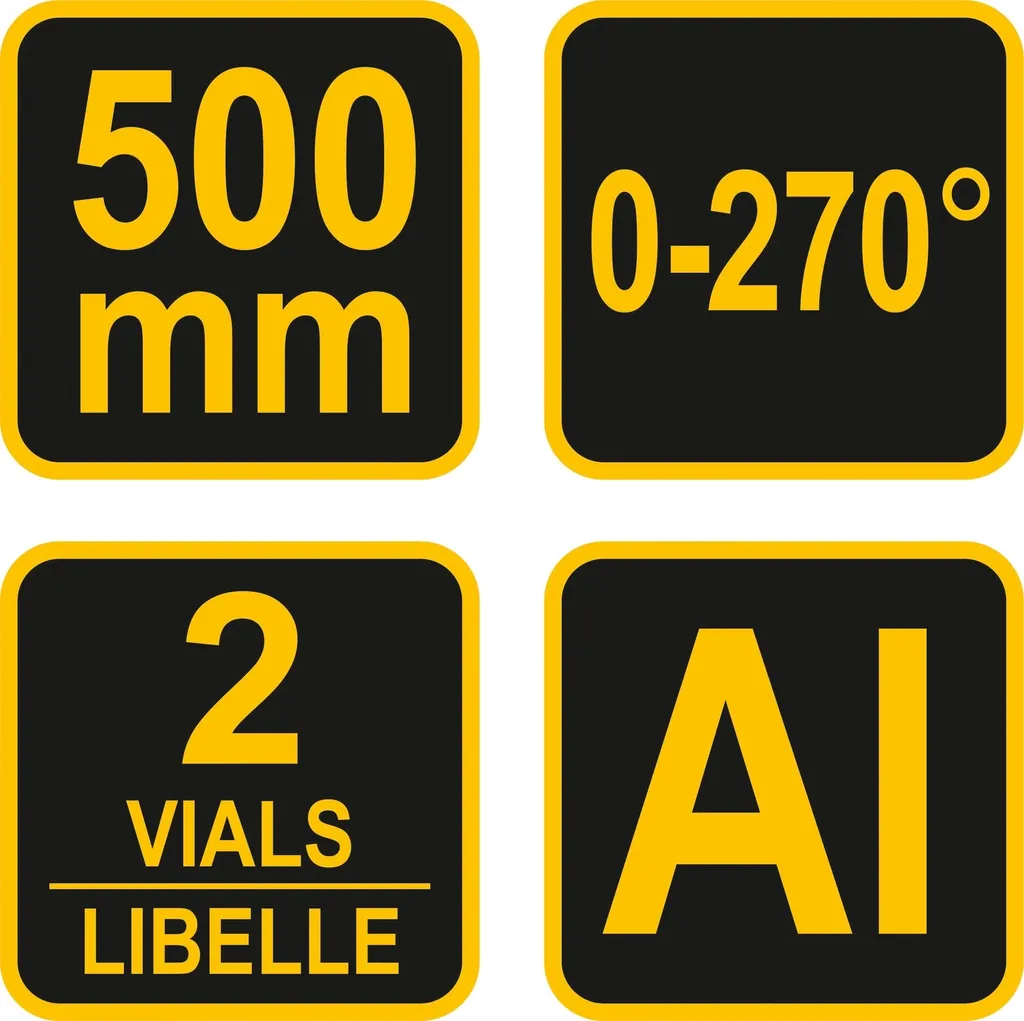 KUTOMJER 500 MM AL VOREL ukupne dužine cca 630 mm Ruke od aluminijskog profila, glava vage od plastike. Dva ugrađena vretenca. Na unutrašnjoj ivici krakova milimetarska skala od 1-500 mm Dodatni elementi 2 klizna pravila za pozicioniranje, stolarska olovka, dvije olovke za funkciju kružnice.