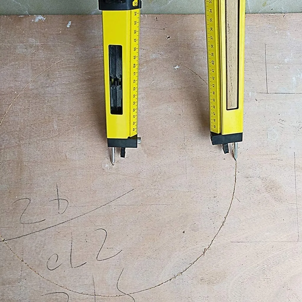Dva ugrađena vretenca. Na unutrašnjoj ivici krakova milimetarska skala od 1-500 mm Dodatni elementi 2 klizna pravila za pozicioniranje, stolarska olovka, dva šiljka za funkciju kružnice.