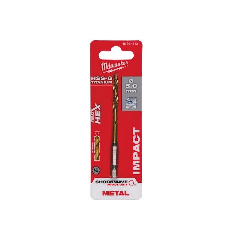 BORER RED HEX HSS-TIN 5.0 mm MILWAUKEE 48894712 – namijenjeno za precizno i brzo bušenje metala u zahtjevnim uslovima, naročito kada se koristi s udarnim alatima s hex prihvatom alata.