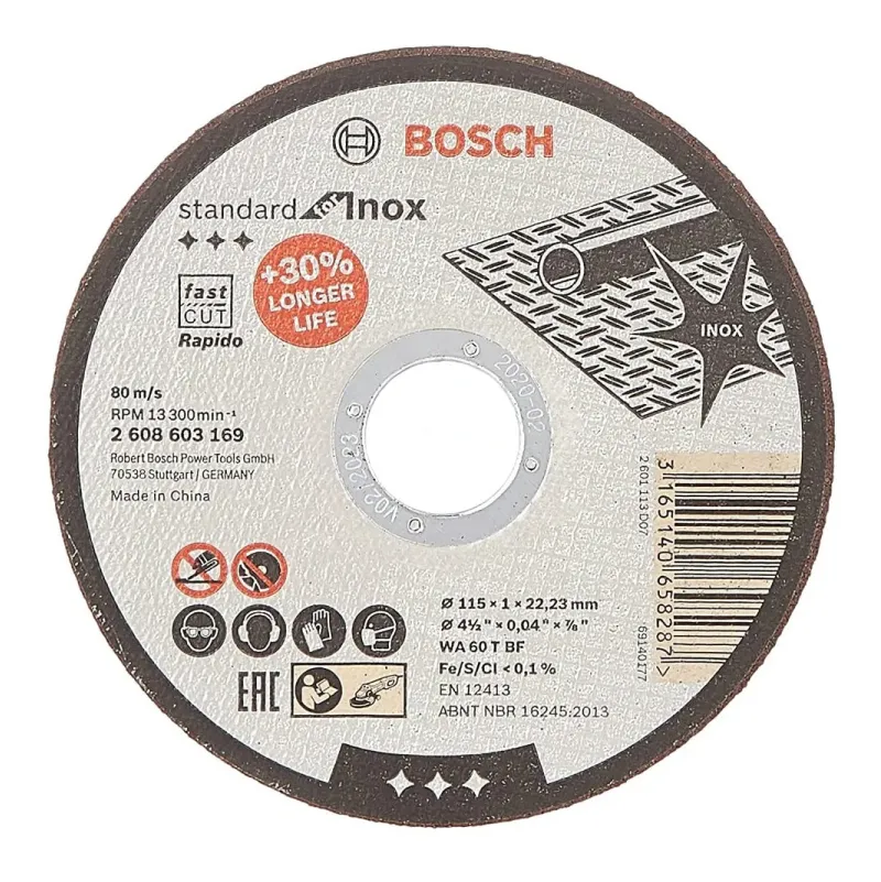 Standard za Inox reznu ploču dobar je izbor za pouzdanu obradu čelika. Disk je izrađen od aluminijskog oksida – posebno razvijen za upotrebu s Inoxom. Ne sadrži željezo, sumpor i klorirana punila. Koristite ovaj disk za rezanje inoxa. Za Bosch kutne brusilice. Bosch rezni diskovi zadovoljavaju najviše sigurnosne zahtjeve kao što je EN 12413. Specifikacija: WA 60 T BF, promjer mm: 115, promjer rupe mm: 22,23, debljina mm: 1,0