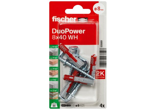 Fischer DuoPower nudi vrlo dobre vrijednosti držanja kao rezultat svoje 2 komponente: Ovisno o građevinskom materijalu, sive komponente izrađene od visokokvalitetnog najlona automatski aktiviraju optimalnu funkciju proizvoda (širenje, preklapanje, vezivanje) za najbolje držanje. Krila za proširenje crvene komponente podržavaju sigurno širenje i nude dodatnu sigurnost sivoj komponenti. Lako uvrtanje vijka i pravilno “zatezanje” za zatvaranje. Nema pretjeranog zatezanja vijaka. Unaprijed oblikovani rub na glavi tipla sprječava klizanje tipla u probušenu rupu.