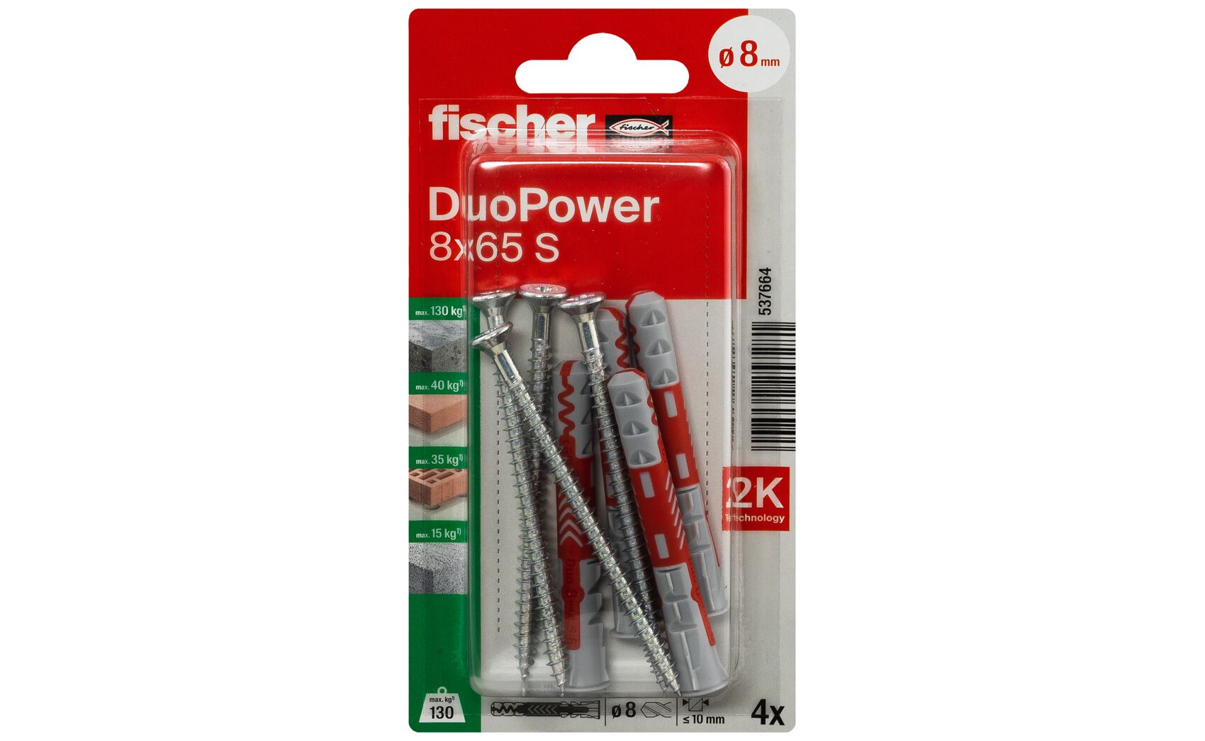 Fischer DuoPower nudi vrlo dobre vrijednosti držanja kao rezultat svoje 2 komponente: Ovisno o građevinskom materijalu, sive komponente izrađene od visokokvalitetnog najlona automatski aktiviraju optimalnu funkciju proizvoda (širenje, preklapanje, vezivanje) za najbolje držanje. Krila za proširenje crvene komponente podržavaju sigurno širenje i nude dodatnu sigurnost sivoj komponenti. Lako uvrtanje vijka i pravilno “zatezanje” za zatvaranje. Nema pretjeranog zatezanja vijaka. Unaprijed oblikovani rub na glavi tipla sprječava klizanje tipla u probušenu rupu.
