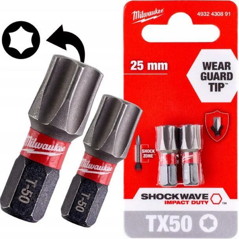 BIT TX50x25 2/1 IMPACT MILWAUKEE 4932430891 – dizajnirana za upotrebu sa udarnim izvijačima. Linija dodatne opreme SHOCKWAVE™ IMPACT DUTY nije idealna samo za teške udarne aplikacije, već takođe pruža kompletno sistemsko rešenje za sve potrebe korisnika za bušenje i pričvršćivanje.