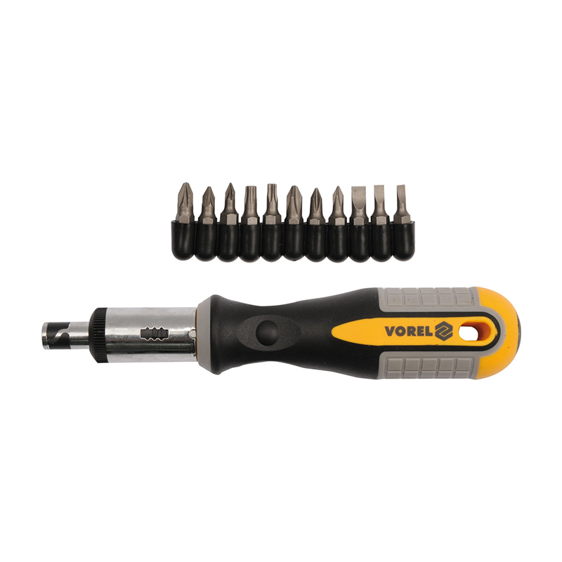 IZVIJAČ SET SA NASTAVCIMA VOREL je profesionalni set odvijača s čegrtaljkom i 12 bit nastavaka, idealan za kućnu,