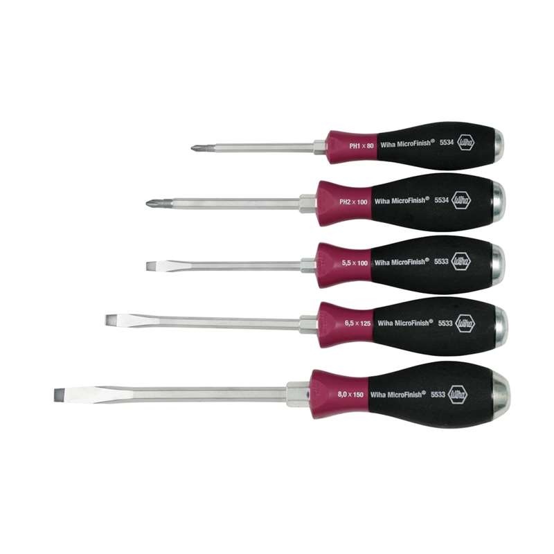 Masno ili vlažno radno okruženje predstavlja rizik da ručka odvijača pruža malu potporu i korisnici ne mogu primijeniti veći zakretni moment. Odvijač MicroFinish otklanja takve probleme zahvaljujući svojoj mikrofinoj površini i jamči optimalno prianjanje. Čvrsta čelična kapa na kraju ručke omogućuje izravno čekanje – na primjer, otpustiti vijke koji su zapeli. Energija udara prenosi se bez ikakvih gubitaka zbog izravne veze između čvrste čelične kape i oštrice. Šesterokutna glava na oštrici omogućuje prijenos većih obrtnih momenta pomoću vijčanog ključa. Wiha odvijači također se ističu zbog svog sofisticiranog koncepta veličine ručke. Duge, vitke veličine ručke mogu se koristiti za brzo i čvrsto pričvršćivanje malih vijaka. Postoje i velike veličine ručke za pričvršćivanje velikih vijaka kojima se mogu primijeniti veći zakretni momenti.