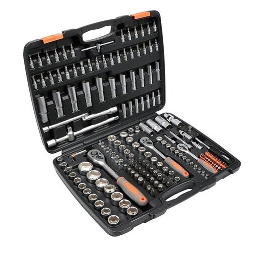 U praktičnoj, izdržljivoj plastičnoj futroli naći ćete ne samo čegrtaljke u tri veličine već i nasadne ključeve. Set ima 1/2, 1/4 inča nastavke i bitove različitih oblika i veličina (uključujući šrafciger).