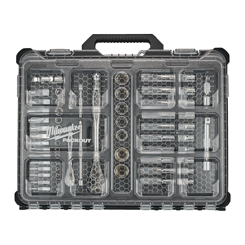 SET NASADNIH KLJUČEVA 1/4” + 1/2” PACKOUT MILWAUKEE 4932493661 je kvalitetan 63-djelni set račni i nasadnih ključeva, dizajniran za zahtjevne korisnike koji traže fleksibilan, organizovan i izdržljiv alat. Posebno je pogodan za rad u uskim i zahtjevnim prostorima, zahvaljujući finom pogonu (90 zuba, 4° zamah) i praktičnim detaljima kao što su FOUR FLAT™ i jasno označene veličine.