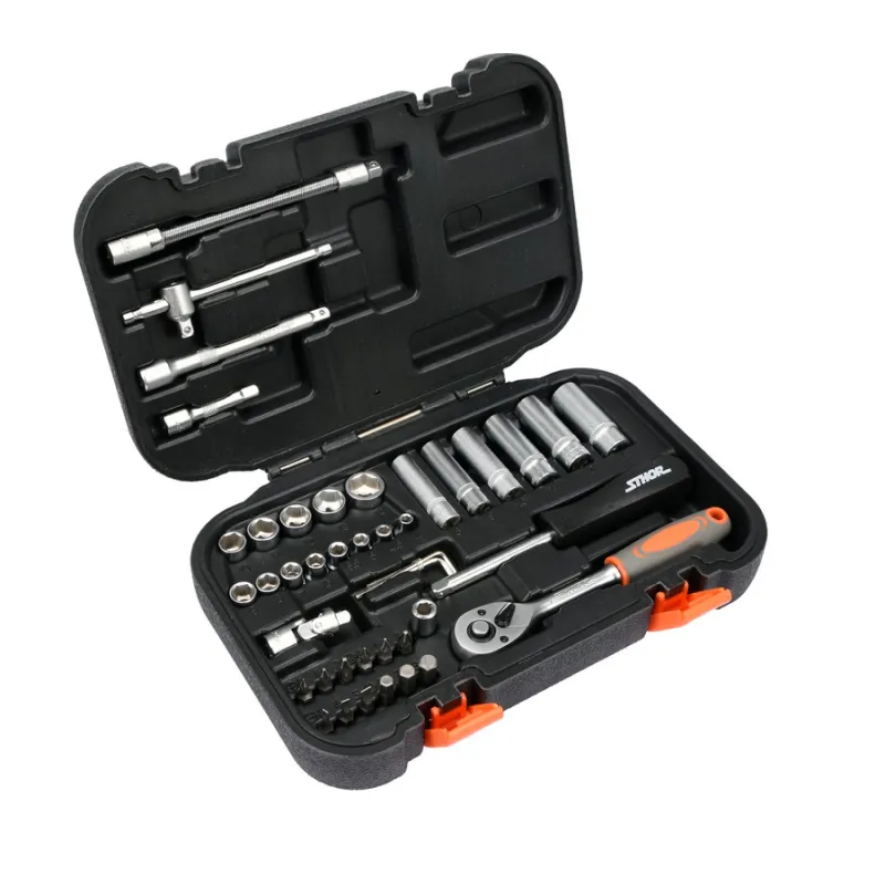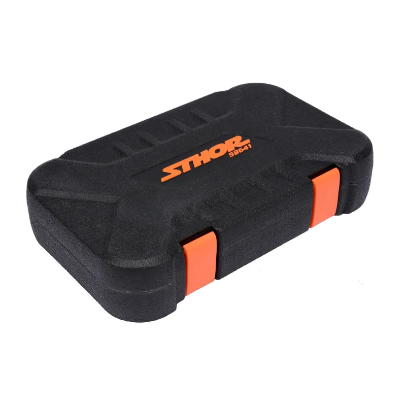 SET NASADNIH KLJUČEVA I BITOVA 1/4” 42 KOM STOHR 58641 sastoji se od 42 elementa smještenih u praktičnom plastičnom koferu. Alati su precizno izrađeni od materijala koji osiguravaju njihovu pouzdanost. Set uključuje cijeli niz 1/4” nastavaka, produžetaka, kardanskog zgloba i mnogih drugih elemenata, uključujući račnu s 45 zuba. Ova konfiguracija znači da će se set koristiti za manje montažne radove, mehaničke popravke i mnoge druge radove u kućanstvu ili radionici.