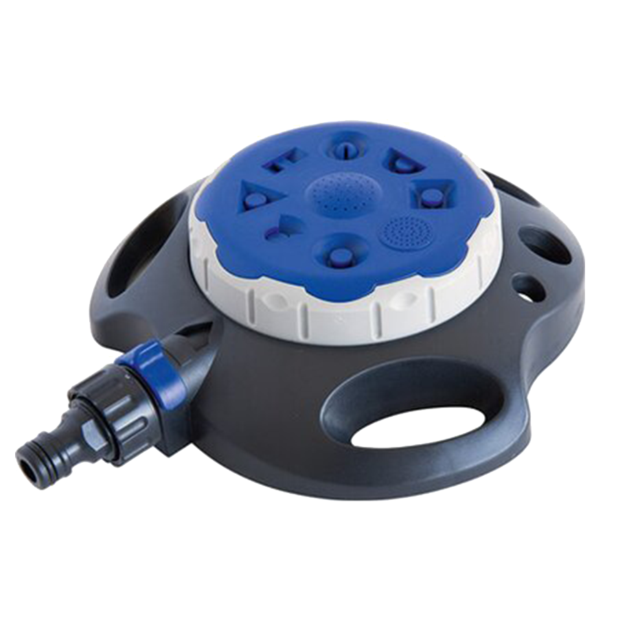 Osmerosmjerna prskalica može se koristiti ovisno o postavci za izračun manjih površina do 68 m². Jednostavnim okretanjem kišnog diska na raspolaganju vam je osam različitih oblika prskanja: krug, pravokutnik, točkasta zraka, polukrug, kvadrat, elipsa, lijevak i četvrti krug. Mekani umetak na disku također pruža ugodno prijanjanje na mokrim površinama. Pritisak vode, a time i protok, mogu se podesiti na prskalici – pojedinačno, ovisno o području proračuna. Široka površina kišnog ogrtača osigurava sigurno postolje. Priključak za vodu kompatibilan je sa svim uobičajenim sistemima spajanja za vodu.