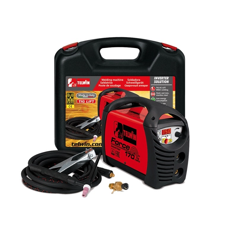 TELWIN APARAT ZA ZAVARIVANJE FORCE TIG 170 DC SA PRIBOROM ZA TIG 816214 je invertorski zavarivač namijenjen za TIG (DC-Lift) i MMA zavarivanje. Radi na jednofaznoj mreži (~230 V). Pogodan je za različite materijale: čelik, nerđajući čelik, titan, bakar, nikl i njihove legure.