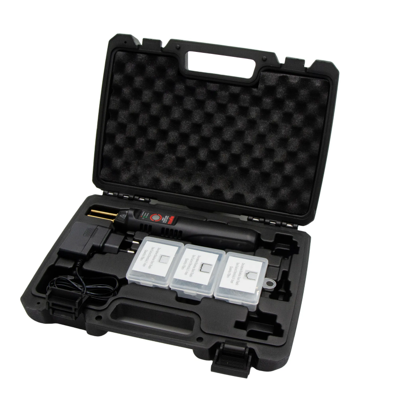 SET ZA POPRAVAK PLASTIKE U PLASTIČNOJ KUTIJI TELWIN 804159 – lagan i jednostavan za rukovanje. Za čvrste i trajne popravke lomova, pukotina i poderotina na tvrdim ili fleksibilnim plastičnim dijelovima. Jednostavan alat za brze i učinkovite popravke. Isporučuje se s praktičnom plastičnom kutijom koja sadrži: