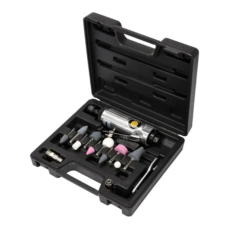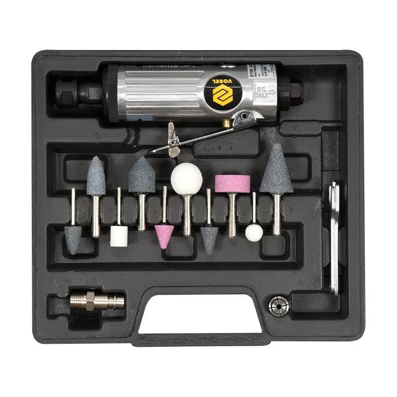 BRUSILICA RAVNA + SET VOREL 81109 je pneumatska ravna brusilica koja se napaja komprimiranim zrakom i dolazi s praktičnim setom od 10 komada pribora.